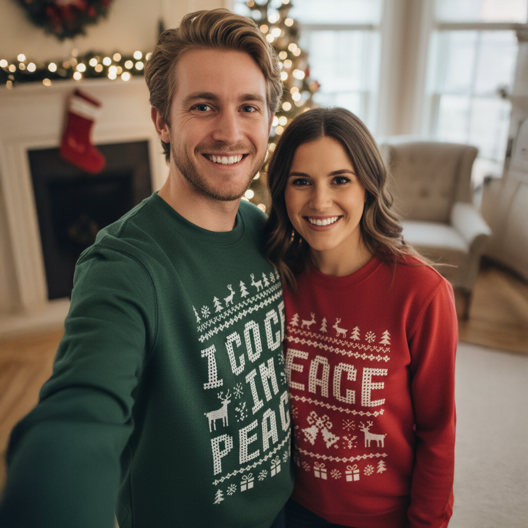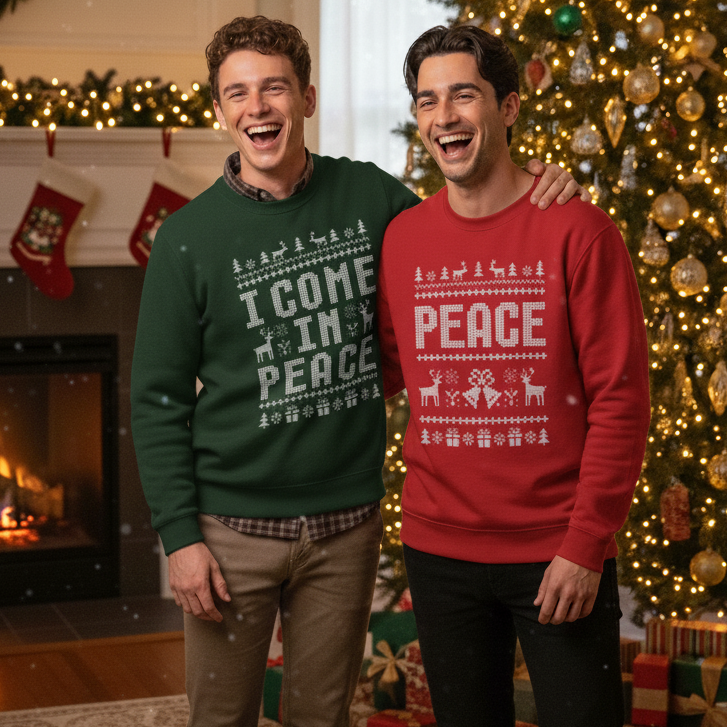 I wore the 'I COME IN PEACE' one to my in-laws'. My wife wore the 'PEACE' one. The look on my mom's face when she finally got the joke was worth the price alone. This is the new gold standard for inappropriate Christmas wear. 10/10.